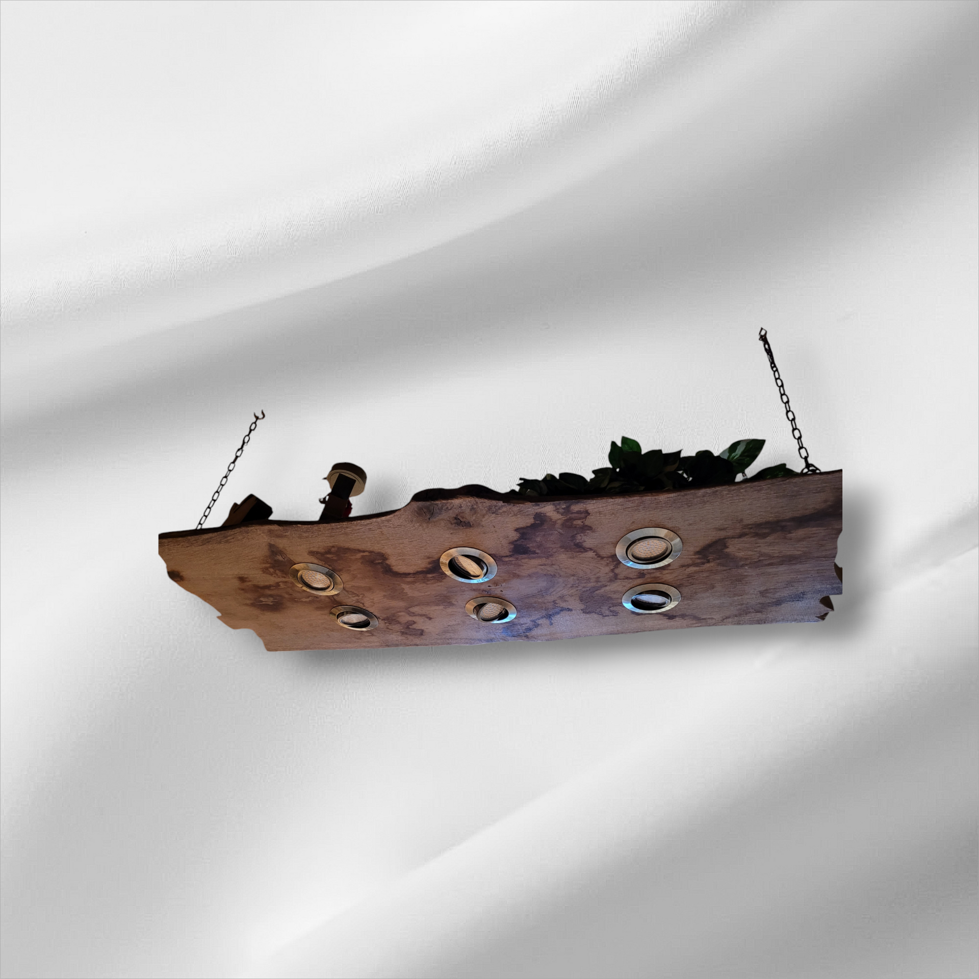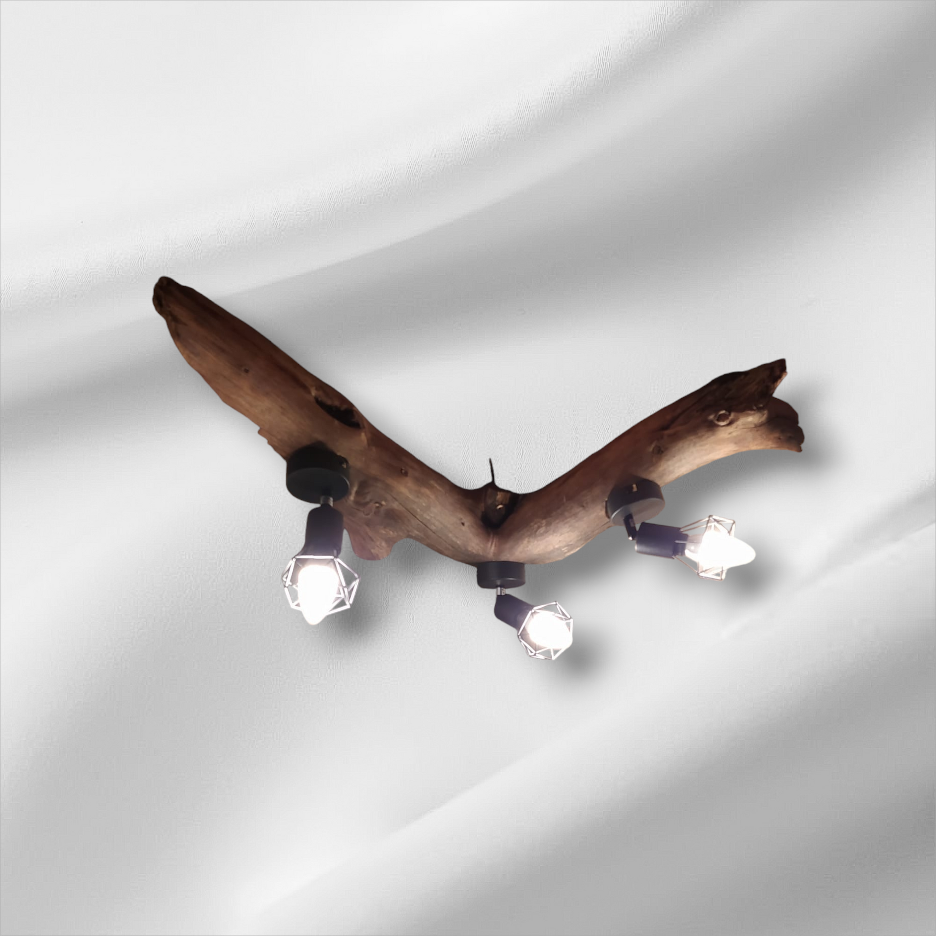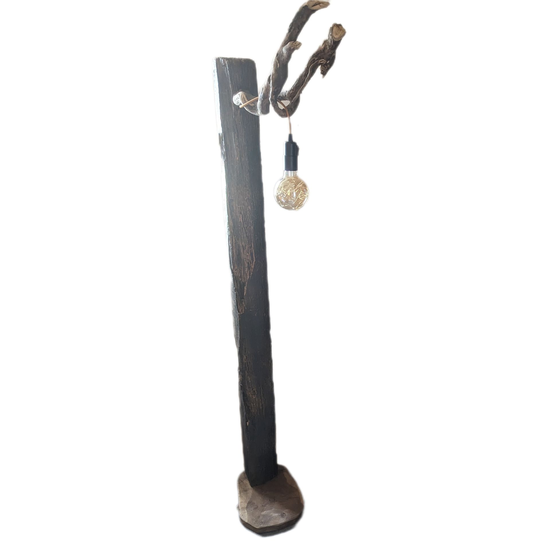 Der alte Balken, gezeichnet von Jahren, von Händen, die ihn berührten, von Winden, die ihn streichelten, bildet das Fundament dieses einzigartigen Leuchtelements.