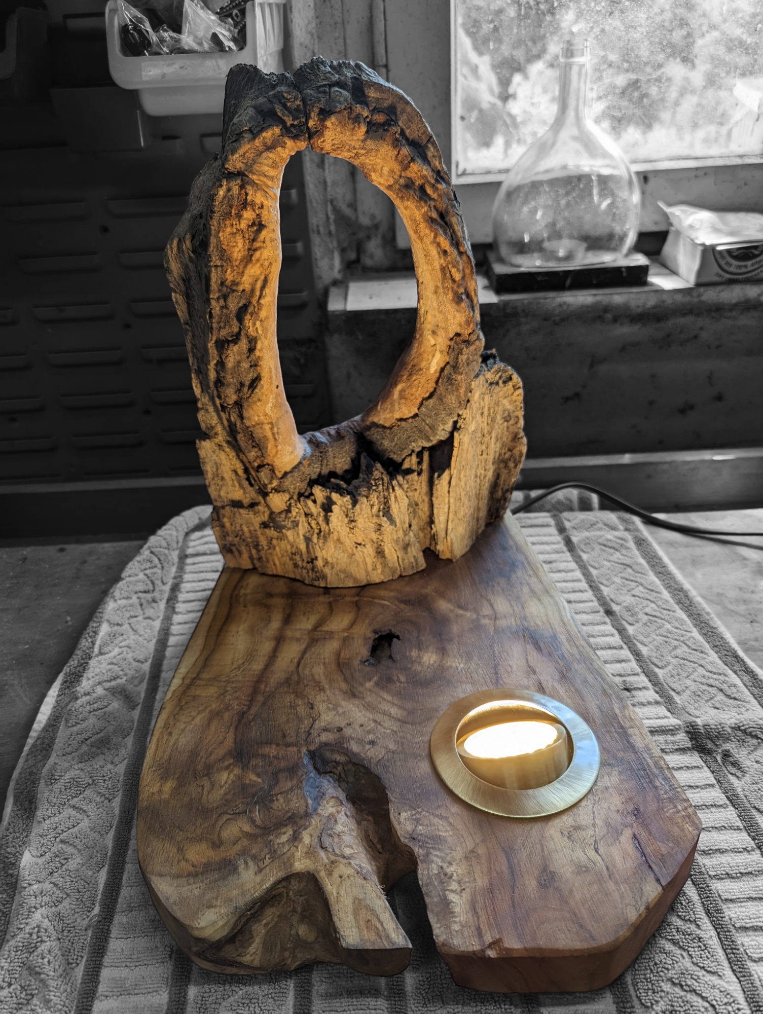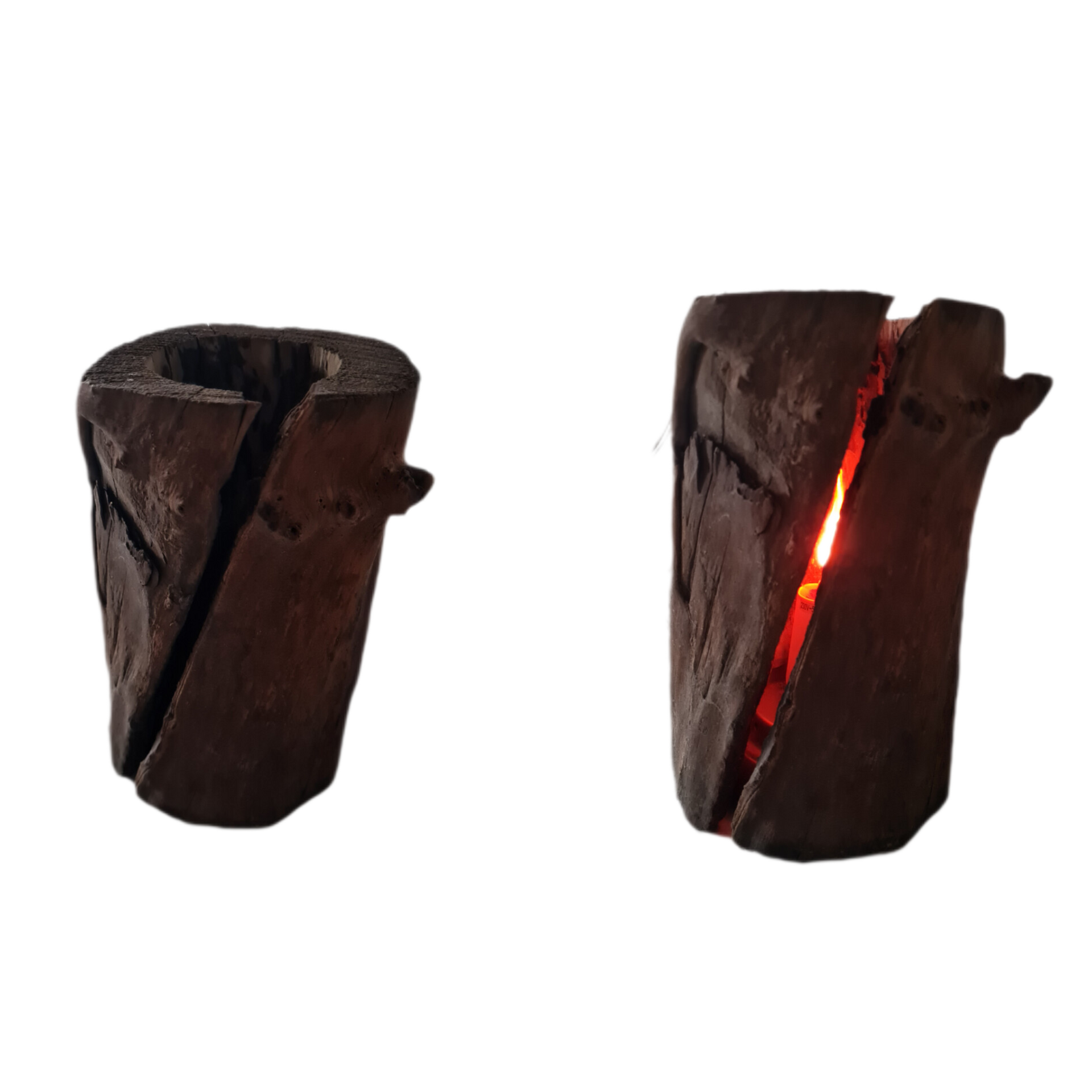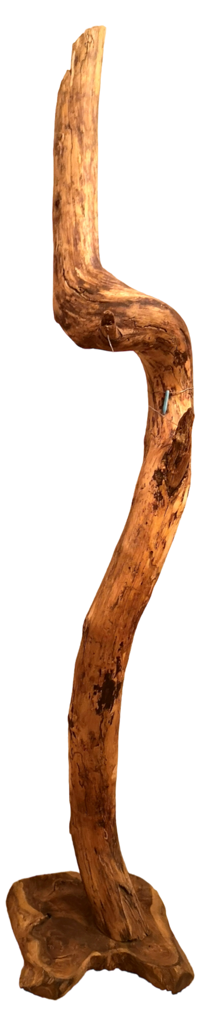 Der alte Balken, gezeichnet von Jahren, von Händen, die ihn berührten, von Winden, die ihn streichelten, bildet das Fundament dieses einzigartigen Leuchtelements.